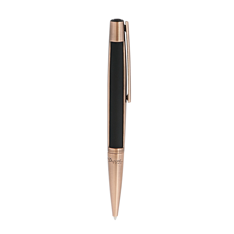 Penna a sfera realizzata con finiture in rame spazzolato. Clip articolata. D in metallo sulla parte superiore.