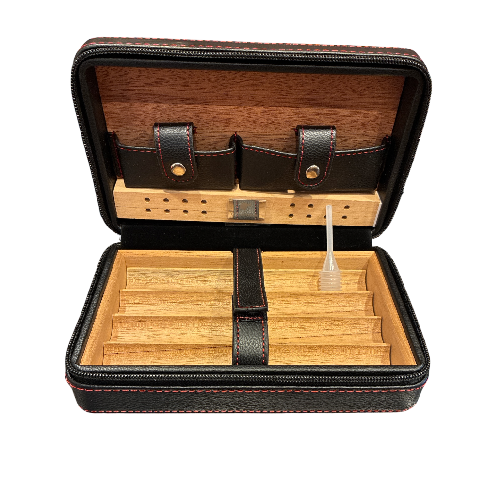 Humidor da viaggio in pelle per 4 sigari con umidificatore interno. Possibilità di alloggiare un accendino e un tagliasigari nel suo allogiamento