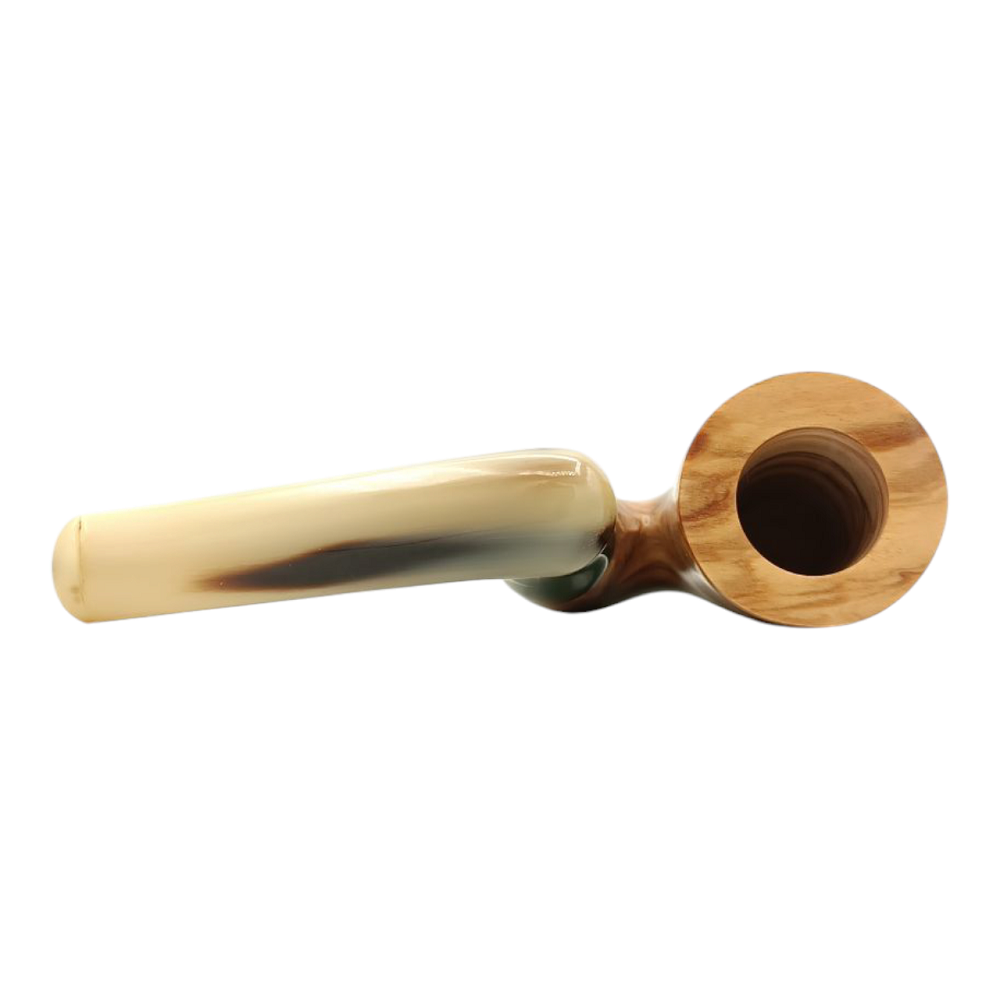 Splendida pipa tascabile, che ricorda la Savinelli Roley, con il fornello ora circolare che permette la formazione della crosta protettiva in modo omogeneo; in olivastro e bocchino in corno di bufalo.