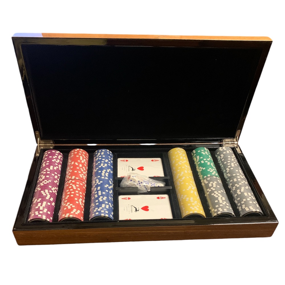 scatola 300 chips noce lucido con intarsio. Carte Modiano e dadi.