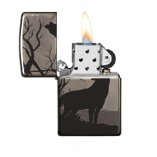 Che tu sia un lupo solitario o una parte di un branco, questo nuovo accendino per lupi è destinato a soddisfare tale esigenza. In questa scena mozzafiato, troverai la sagoma di un lupo che ulula nella notte, nel profondo di una foresta ombrosa. Ruota l’accendino per trovare un altro lupo di guardia sul retro. Questa immagine circumnaviga perfettamente l’intera superficie di un accendino Black Ice® utilizzando il processo Photo Image 360​​°. Viene confezionato in una scatola regalo. Per prestazioni ottimali, utilizzare il fluido di ricarica originale per accendini Zippo.